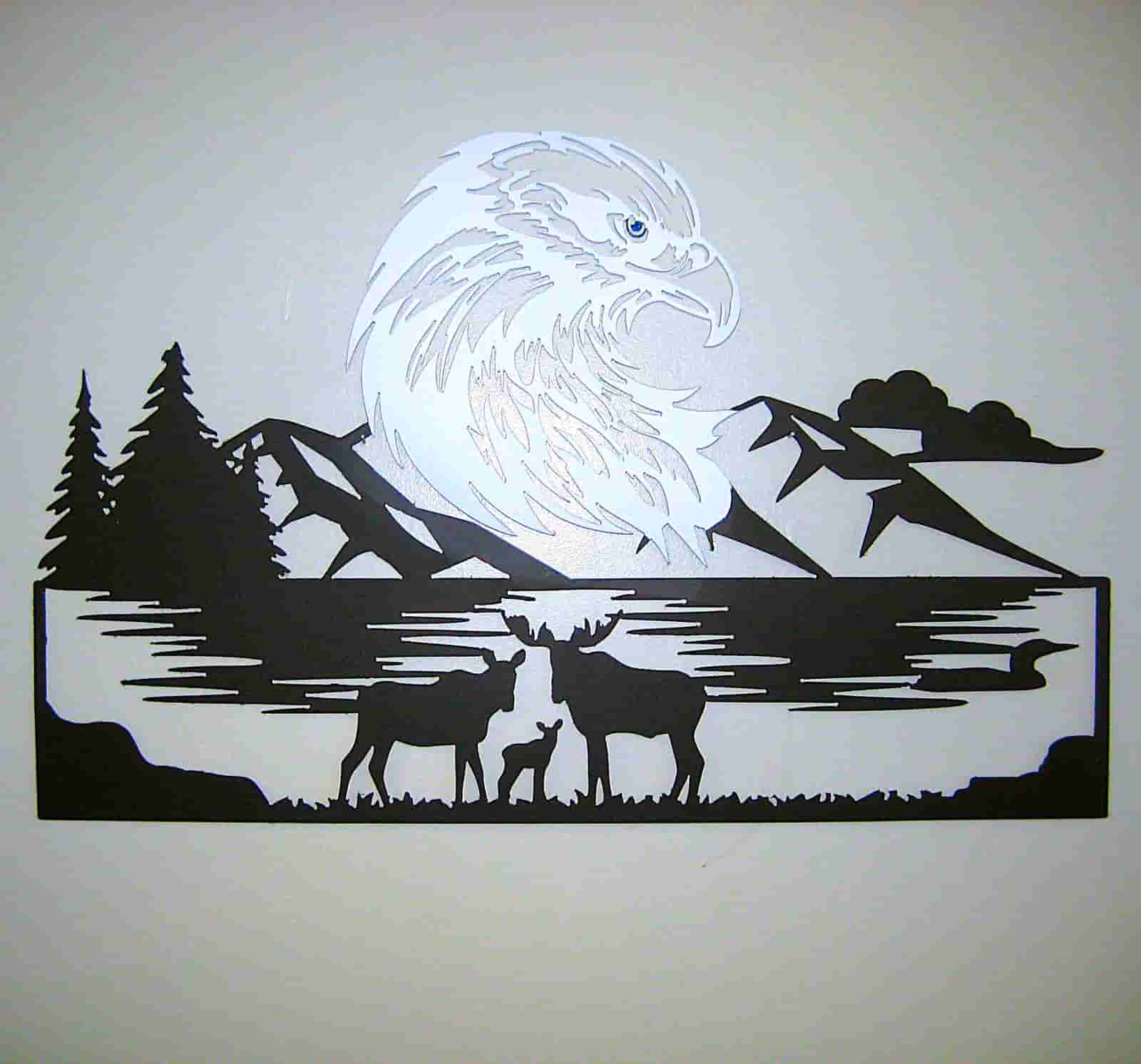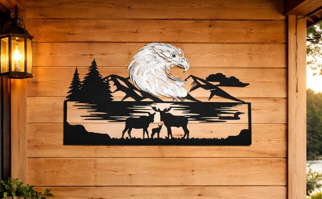 From our Industry 4.0 micro-factory on the North Shore of Lake Superior, we manufacture solutions, not just decor. This massive 34″ x 22″ piece is a masterclass in perspective-driven storytelling. The serene strength of the moose family in the foreground provides a grounding counterpoint to the powerful presence of the bald eagle, whose silhouette dominates the mountain backdrop and is finished in a resilient white to catch the light.